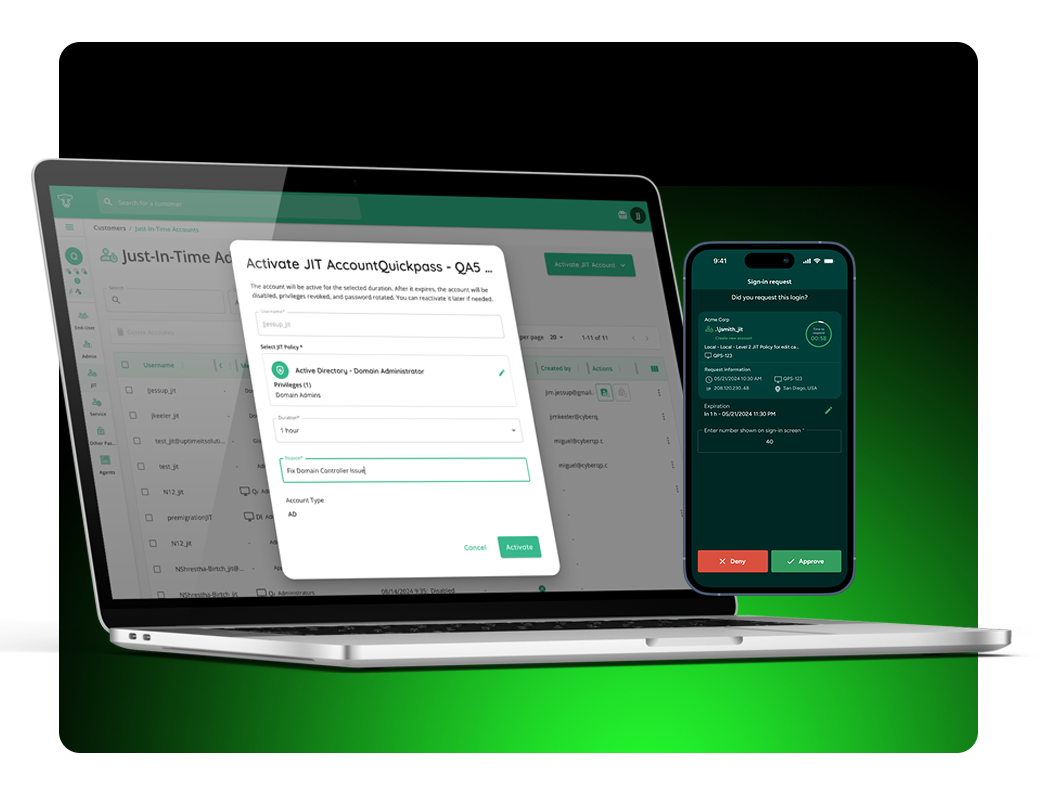 CyberQP follows a deliberate sequence: discover what exists, secure it and replace shared persistent access with zero standing privilege just in time access. Shared access is eliminated by locking down break glass accounts and replacing day-to-day technician access with just-in-time named accounts — so no one holds standing privileges they don't need.