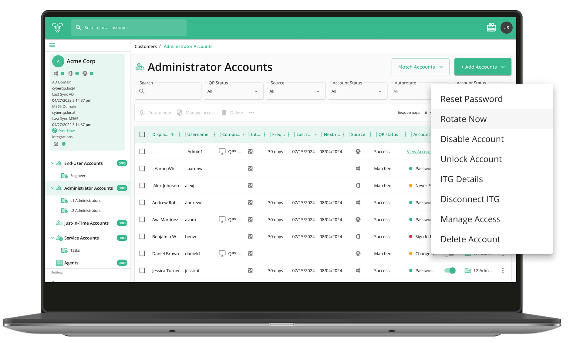CyberQP rotates every shared and break glass admin password daily and syncs automatically to IT Glue or Hudu. Each tech gets a named JIT account that self-destructs after use — no shared credentials involved.